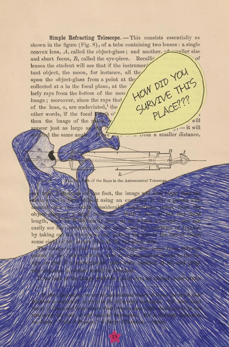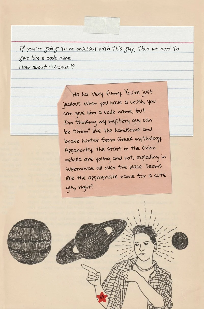 In the beginning of the book, we are thrown into a chance encounter that leads to the unlikely friendship between two anonymous pen pals, who use this shelved library book as the container for their daily musings–it’s a secret diary kept in plain sight. The writers adopt the names Copernicus and Kepler and take on a playful vow to remain anonymous to everyone, including themselves.